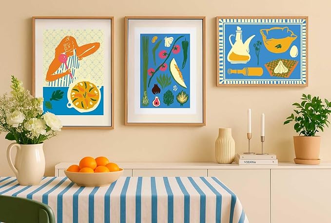 Piensa en la pared como un pequeño escenario. ¿Qué historia quieres que cuente? Puede ser una escena cotidiana, un objeto querido, una abstracción tranquila o un motivo botánico. El truco está en repetir 2–3 colores de esa lámina en lo que ya tienes (cojines, libros, cerámica). Cuando la paleta dialoga, el conjunto respira.
